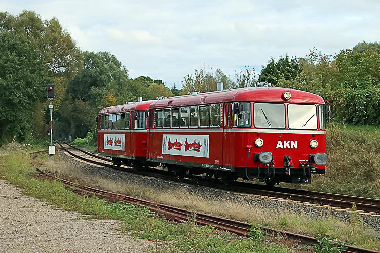 Im Rahmen der am 03.10.2019 in Kiel ausgetragenen Einheitsfeier wurden die beiden roten Brummer 798 308-2 und 798 309-0 der AKN auf der RB 76 zwischen Kiel Hbf und Kiel-Oppendorf im Plandienst eingesetzt.