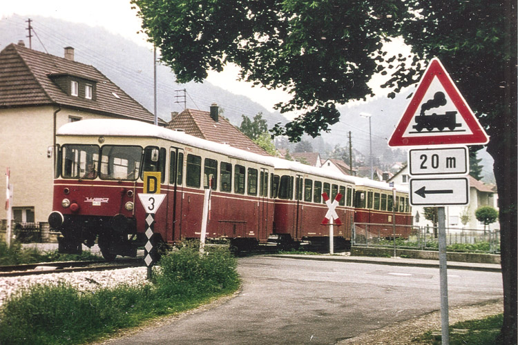 VS 111 + VB 112 + VT 09 der WEG (Linie Ebingen-Onstmettingen) in Fahrtrichtung Nord am Haltepunkt Truchtelfingen-Holdertal in der zweiten Hälfte der 80er-Jahr.
